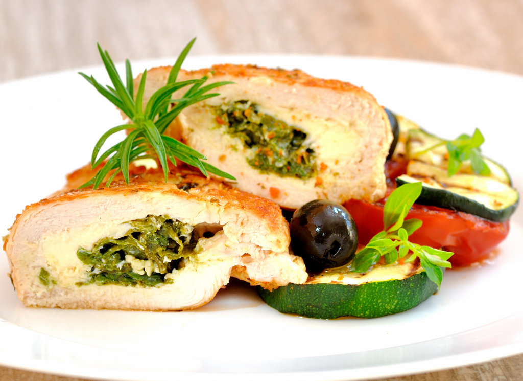 • Stuff each chicken breast with seasoned vegetable and cheese filling.