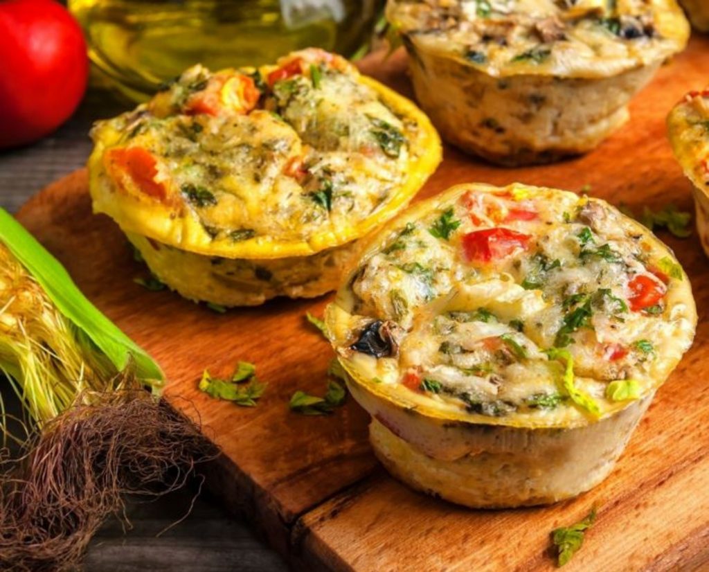 • In a large bowl, beat eggs until smooth. Add milk, salt and cheddar cheese and mix. Stir in sweet peppers, garlic, onion and thyme into the egg mixture. Ladle the egg mixture into each lightly greased muffin tin until ¾ full.